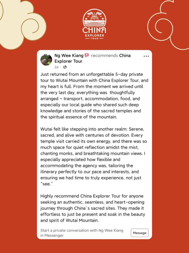 “My heart is full.” At China Explorer Tour (CET), we live for moments like this. We recently received an incredibly touching review from a guest who returned from a 5-day private journey to Mount Wutai, and their words perfectly capture the "why" behind everything we do.